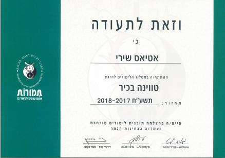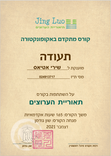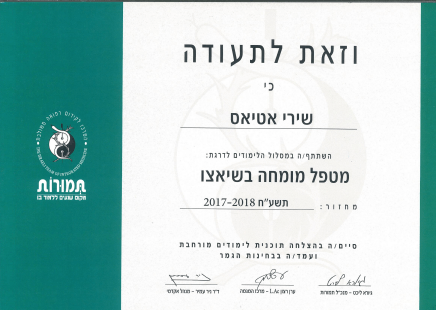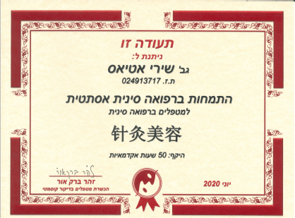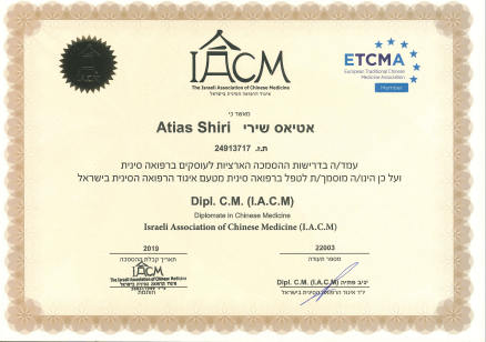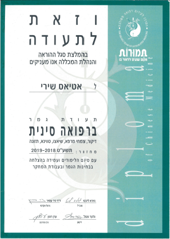 חברה באגודה הישראלית לריפוי סיני מסורתי לאחר שעברה בהצלחה את מבחני ההסמכה הארציים.